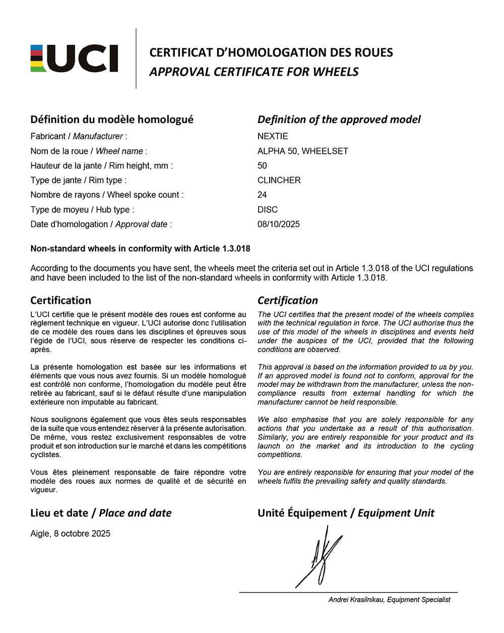 The certification document is follows: WHEEL-APPROVAL-PROCESS-CERTIFICATE-NEXTIE-ALPHA-50.pdf